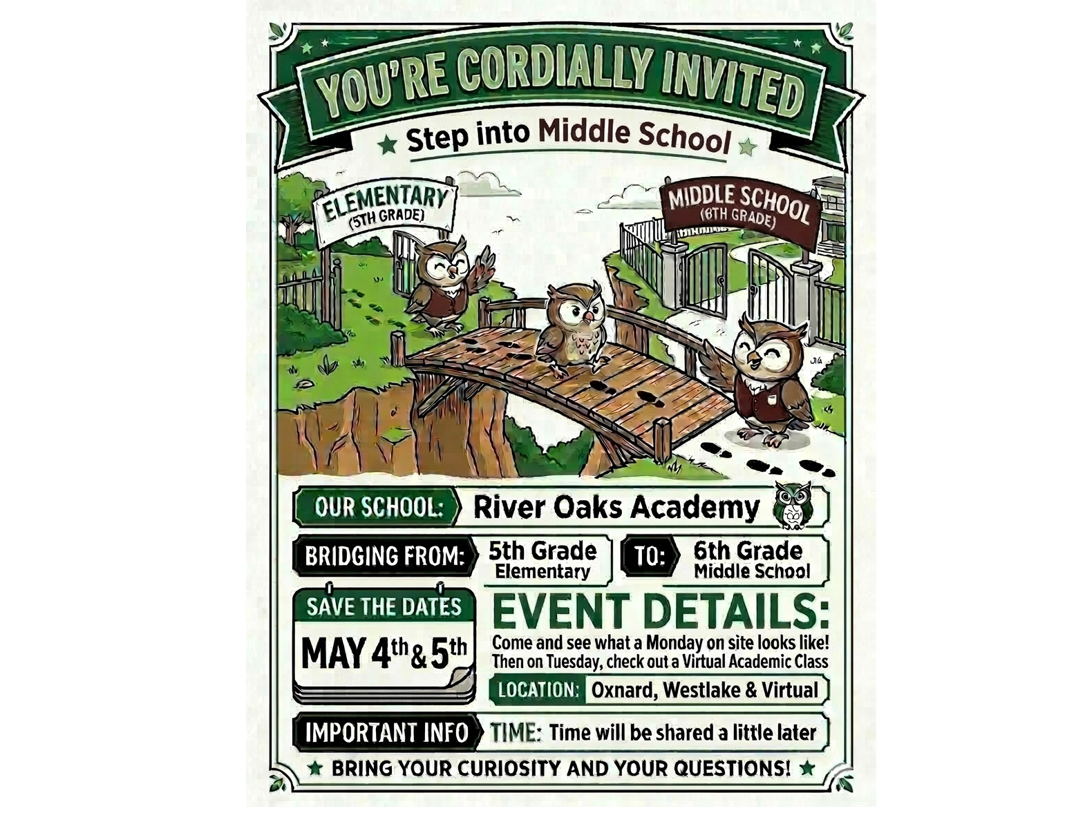 This two-day preview helps students explore middle school, experience different learning environments, and begin their transition from elementary to ROA middle school with confidence.